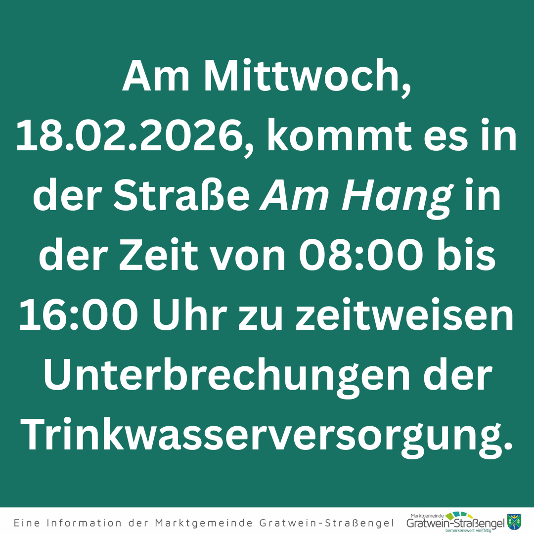 Liebe Bürger*innen, am Mittwoch, 18. Februar 2026, ist in der Straße Am Hang (8112 Gratwein-Straßengel) zwischen 08:00 und 16:00 Uhr mit zeitweisen Unterbrechungen der Trinkwasserversorgung zu rechnen.