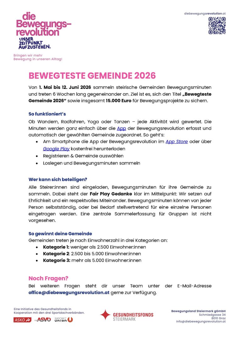 Von 1. Mai bis 12. Juni 2026 sammeln steirische Gemeinden Bewegungsminuten und treten 6 Wochen lang gegeneinander an. Ziel ist es, sich den Titel „Bewegteste Gemeinde 2026“ sowie insgesamt 15.000 Euro für Bewegungsprojekte zu sichern.