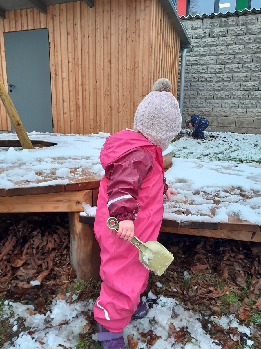 Kurz bevor wir mit der Jause fertig sind, hören wir aus dem Kinderzimmer bereits unser Aufräumlied. Wir essen noch gemütlich zu Ende und nachdem wir unseren Platz abgeräumt haben, gehen wir ins Kinderzimmer. Dort haben schon einige Kinder am großen Teppich Platz genommen und warten gespannt welche Lieder wir heute wieder singen und was es noch alles zu staunen gibt. Mit unserem Abschluss Kreislied machen wir uns auf den Weg in den Garten. Gemeinsam mit meinen Freunden schnappe ich mir ein Fahrzeug und entdecke den ganzen Garten. Juhu, wir dürfen pritscheln, schnell ziehen wir uns unsere Schuhe aus und hüpfen in die Sandkiste. Bei uns gibt’s wirklich immer etwas zu entdecken. Nanu, mir knurrt schon der Magen. Zum Glück geht es jetzt zum Mittagessen.