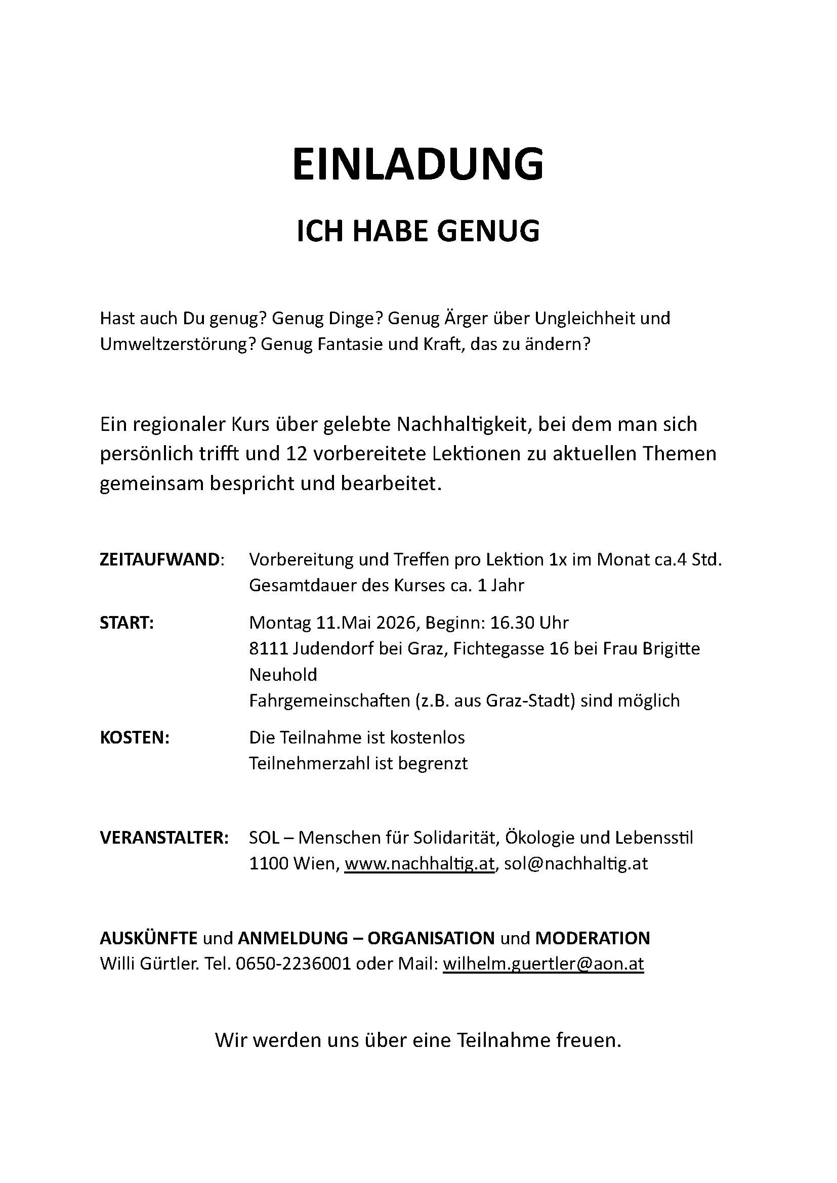 Hast auch Du genug? Genug Dinge? Genug Ärger über Ungleichheit und Umweltzerstörung? Genug Fantasie und Kraft, das zu ändern? Ein regionaler Kurs über gelebte Nachhaltigkeit, bei dem man sich persönlich trifft und 12 vorbereitete Lektionen zu aktuellen Themen gemeinsam bespricht und bearbeitet.