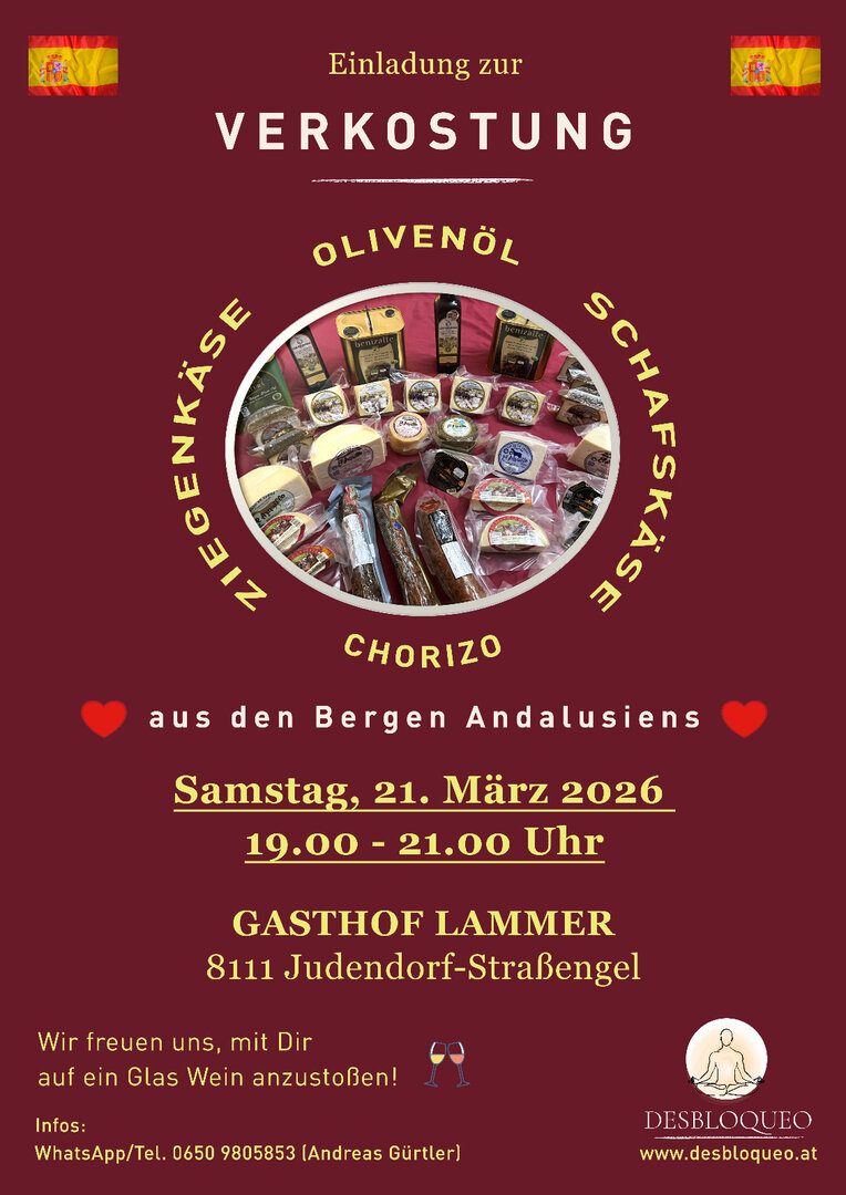 Einladung zur Verkostung - Olivenöl, Schafskäse, Ziegenkäse & Chorizo aus den Bergen Andalusiens.